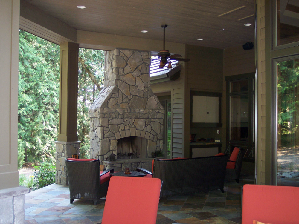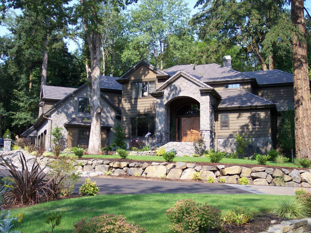 The Cherry Lane Custom Home is a masterclass in classic Northwest architecture, blending traditional elegance with the rugged beauty of its natural surroundings. The exterior is defined by grand stone-clad pillars and warm wood siding, creating a stately presence that feels both grounded and inviting. A standout feature of this build is the expansive, multi-level outdoor living space, designed to capture sweeping views while providing a protected sanctuary for year-round enjoyment.
