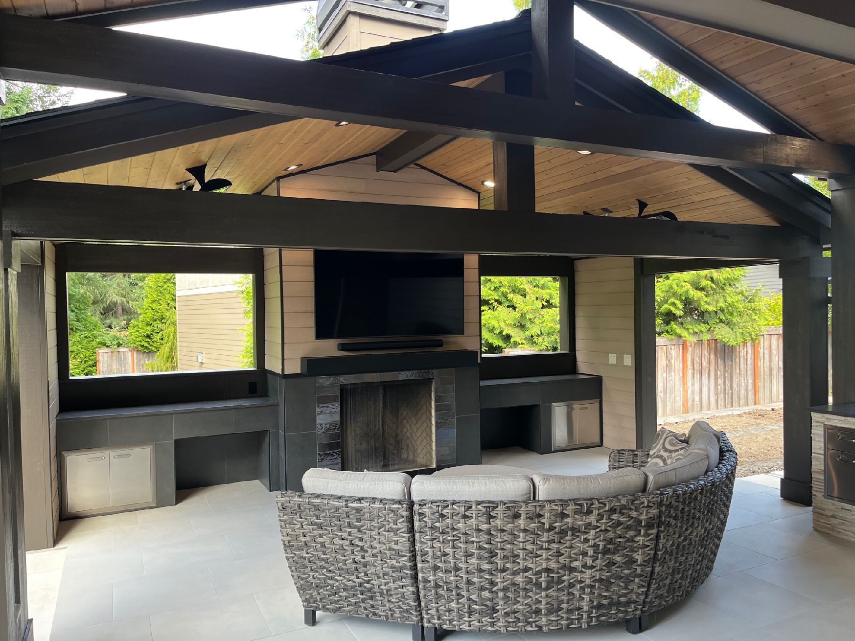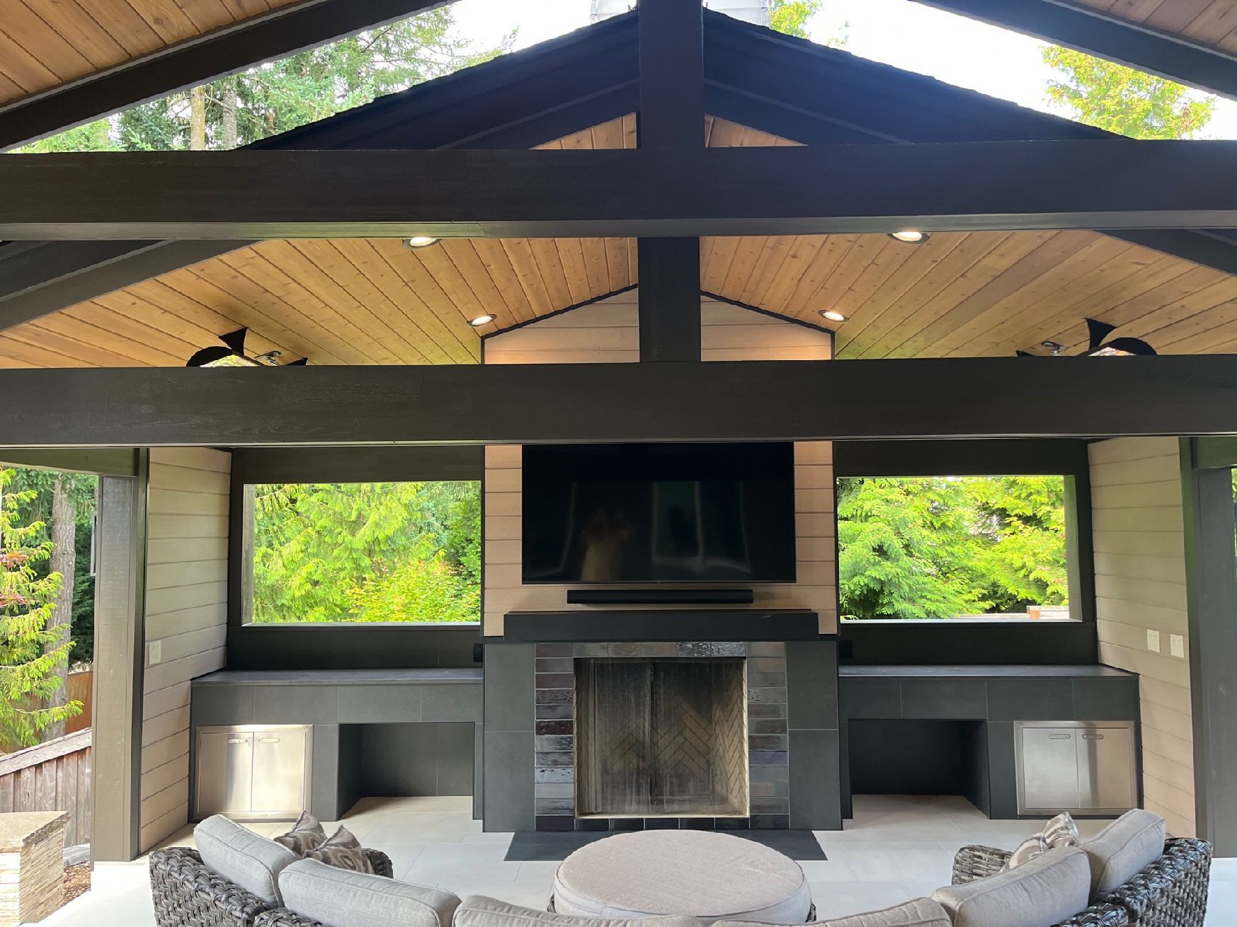 - Outdoor Entertainment Pavilion: A year-round living space with a grand stone fireplace, integrated media systems, and a wood-coffered ceiling that provides a seamless transition to the outdoors.