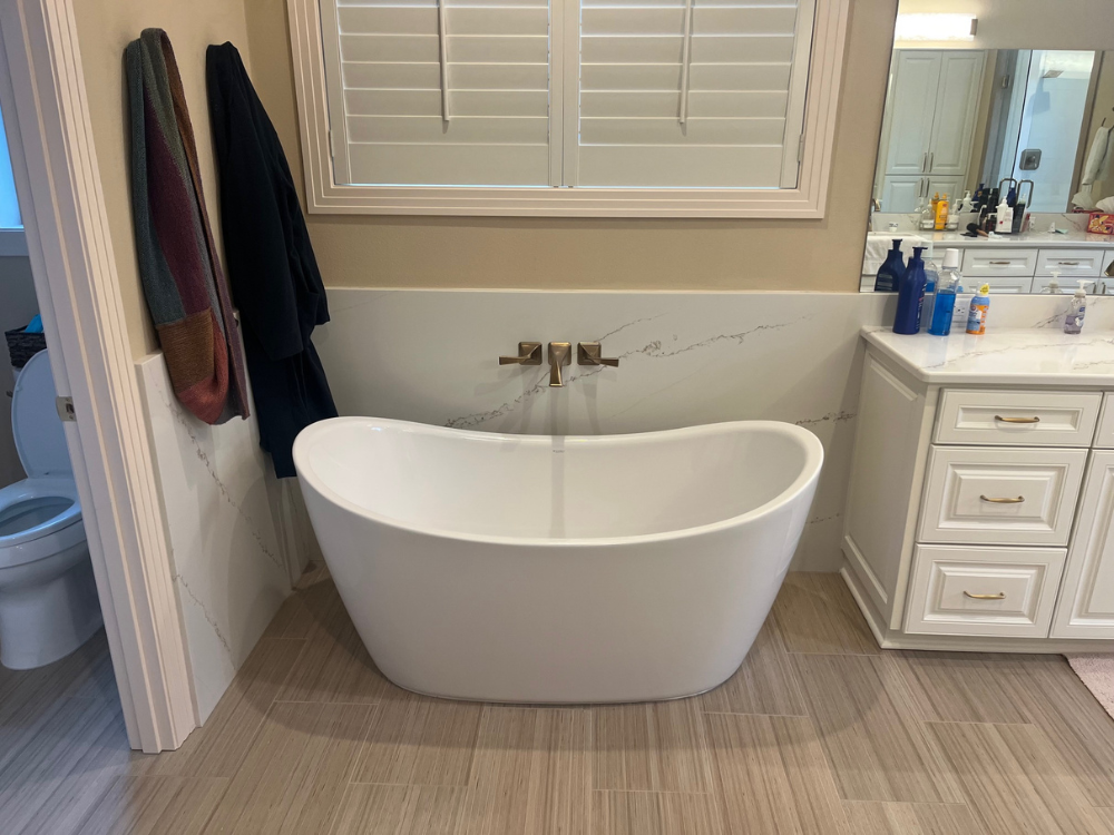 The sophisticated aesthetic of the kitchen flows seamlessly into the master bath remodel, where the same commitment to modern elegance is on full display. We replaced the original dated fixtures with a spa-inspired layout featuring a curbless walk-in shower with floor-to-ceiling tiling and a minimalist glass enclosure. The new vanity mirrors the kitchen’s cabinetry and hardware for a cohesive whole-home feel, complemented by high-performance features like a TOTO toilet and designer lighting. Every detail, from the precision of the tilework to the seamless transition between materials, reflects Skreen Construction’s signature "detailed touch".