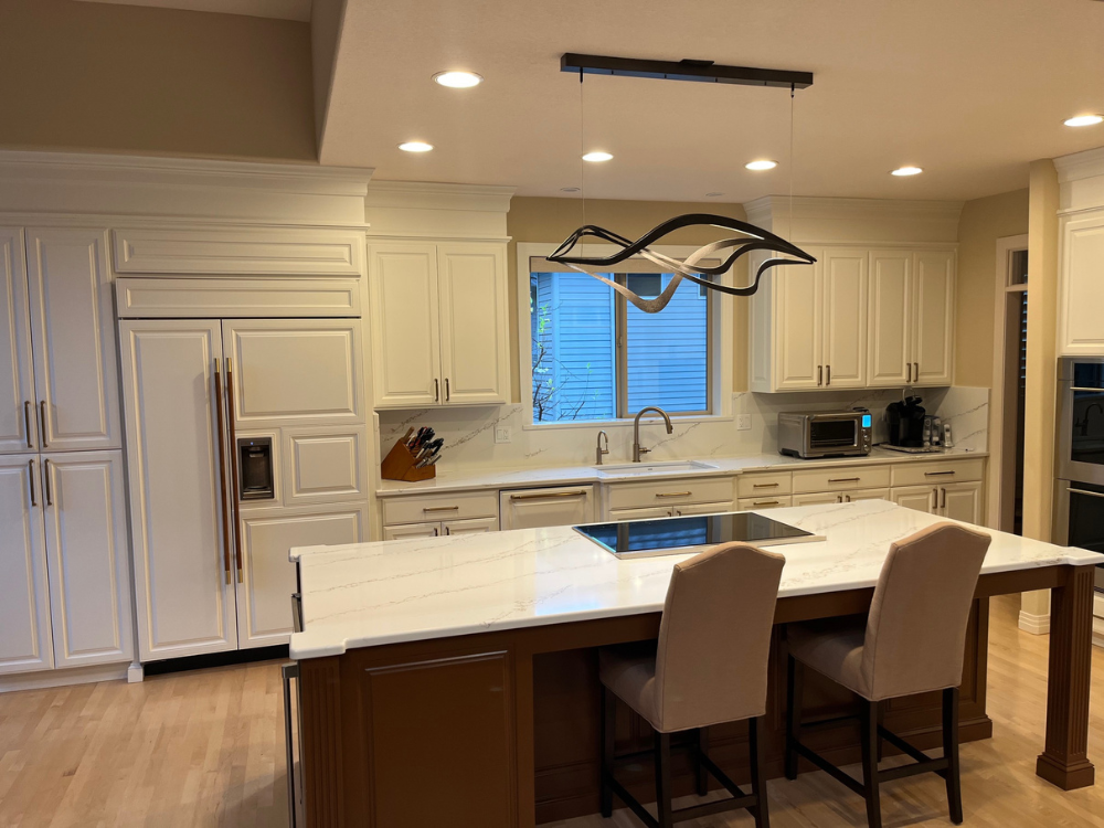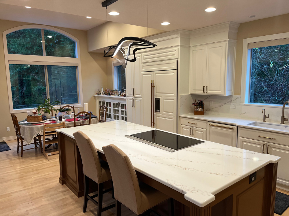 The Turner Remodel in West Linn’s Barrington Heights neighborhood is a stunning example of how a strategic renovation can breathe new life into a classic home. Skreen Construction took a kitchen previously defined by heavy, dark wooden cabinetry and dated black granite countertops and reimagined it into a bright, contemporary sanctuary. The transformation features a massive island topped with sleek marble-veined quartz, perfectly paired with crisp white custom cabinetry that extends to the ceiling to maximize light and space. High-end integrated appliances and a unique, modern sculptural light fixture serve as the "functional artwork" of the room, while luxurious new hardwood flooring provides a warm, sturdy anchor for the entire open-concept living area.